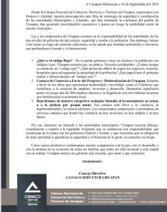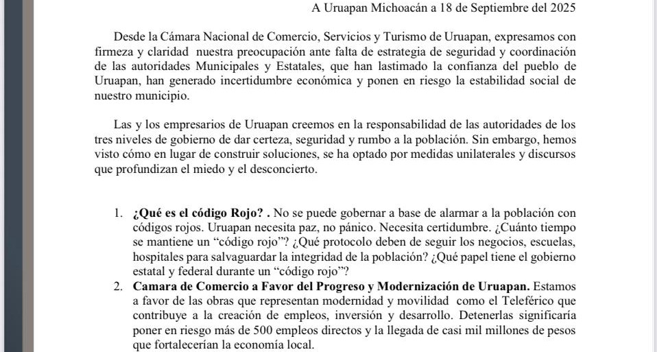 Al mismo tiempo, los empresarios enfatizaron que la inversión y el empleo no florecen en ambientes de violencia. ​La organización reiteró su propio compromiso con la paz, el desarrollo y la defensa de la economía de miles de familias uruapenses. (RED 113 MICHOACÁN)
