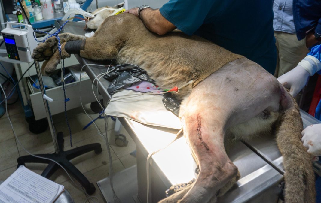 El ejemplar fue trasladado al zoológico en estado crítico y durante la noche fue sometido a una compleja cirugía ortopédica para intentar salvarle la vida. La intervención, en la que participaron especialistas en ortopedia animal, incluyó la colocación de placas de titanio y clavos en sus extremidades; sin embargo, la salud del felino permaneció grave durante toda la noche del miércoles y la mañana de este día.