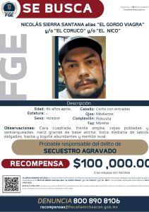 El fiscal, Carlos Torres Piña informó que también en el estado es buscado Nicolás Sierra Santana alias el Gordo, líder de Los Viagras junto con sus cómplices.