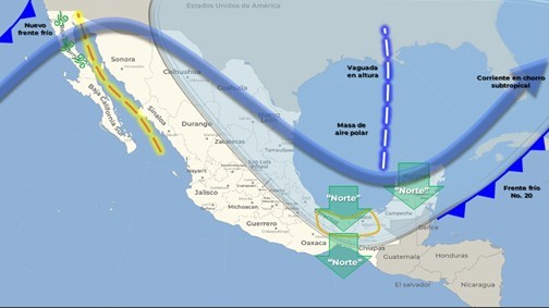 Durante este sábado, la masa de aire polar que impulsó al frente frío No. 20 mantendrá el evento de “Norte” fuerte a muy fuerte en el sur del litoral del Golfo de México y la Península de Yucatán, debilitándose en el transcurso de la tarde, y de igual intensidad en el Istmo y Golfo de Tehuantepec. El frente frío No. 20 se desplazará sobre el Mar Caribe, y dejará de afectar al territorio nacional.