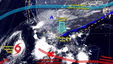 Un canal de baja presión se extenderá sobre el noroeste y occidente del territorio nacional, aunado a la amplia circulación de «Lidia» y a la entrada de humedad generada por la corriente en chorro subtropical, propiciará chubascos y lluvias puntuales muy fuertes en las regiones mencionadas, además de puntuales intensas en Baja California Sur, Nayarit, Jalisco, Colima y Michoacán.