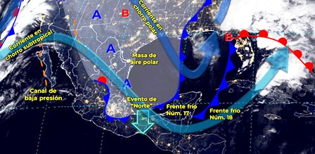 Este día, el frente Núm. 17 se extenderá sobre el norte del Golfo de México, dejando de afectar al país. La masa de aire polar asociada a dicho frente, comenzará a modificar sus características térmicas en el transcurso del día, favoreciendo un gradual ascenso de las temperaturas vespertinas en gran parte del territorio nacional, sin embargo, continuará el ambiente frío a muy frío al amanecer en zonas del noroeste, norte, noreste y centro de México.