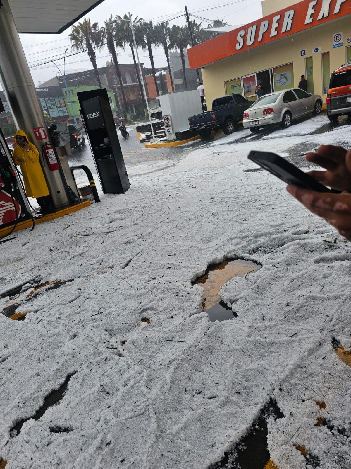 La tormenta inició por la tarde, acompañada de lluvia intensa y ráfagas de viento. En cuestión de minutos, el granizo comenzó a acumularse, formando capas de varios centímetros que tapizaron el suelo, tejados y estructuras ligeras.
