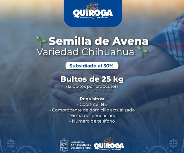 Quiroga, Mich.- Con la firme convicción de fortalecer al campo como uno de los ejes prioritarios del desarrollo municipal, el Gobierno de Quiroga informa que ya se encuentra disponible la semilla de avena variedad Chihuahua, ideal para las condiciones de cultivo de la región.