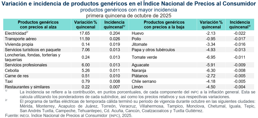 En la primera quincena de octubre de 2025, la variación quincenal de los índices subyacente y no subyacente fue de 0.18 y 0.64 %, en ese orden. En la misma quincena de 2024, fue de 0.23 y 1.08 %.