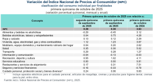En la primera quincena de octubre de 2025, el INPC registró un nivel de 141.608: aumentó 0.28 % respecto a la quincena anterior. Con este resultado, la inflación general anual se ubicó en 3.63 por ciento. En el mismo periodo de 2024, la inflación quincenal fue de 0.43 % y la anual, de 4.69 %.
