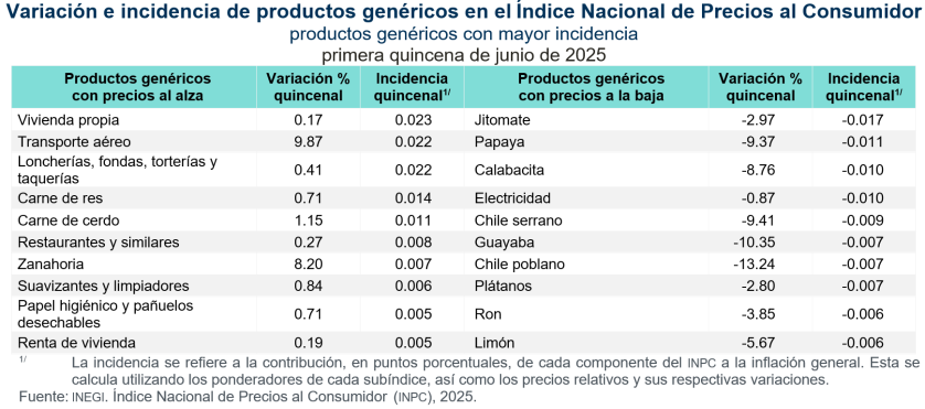 En la primera quincena de junio de este año, los productos genéricos cuyas variaciones de precios, al alza y a la baja, destacaron por su incidencia sobre la inflación general fueron los siguientes: vivienda propia; transporte aéreo; loncherías, fondas, torterías y taquerías, así como carne de res y carne de cerdo, con incrementos en sus precios. En contraste, el jitomate, la papaya, la calabacita y la electricidad disminuyeron sus precios.