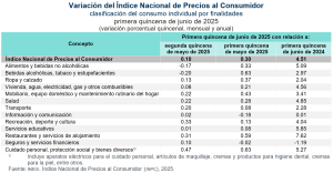 En la primera quincena de junio de 2025, el INPC registró un nivel de 140.292: aumentó 0.10 % respecto a la quincena anterior. Con este resultado, la inflación general anual se ubicó en 4.51 por ciento. En el mismo periodo de 2024, la inflación quincenal fue de 0.21 % y la anual, de 4.78 %.