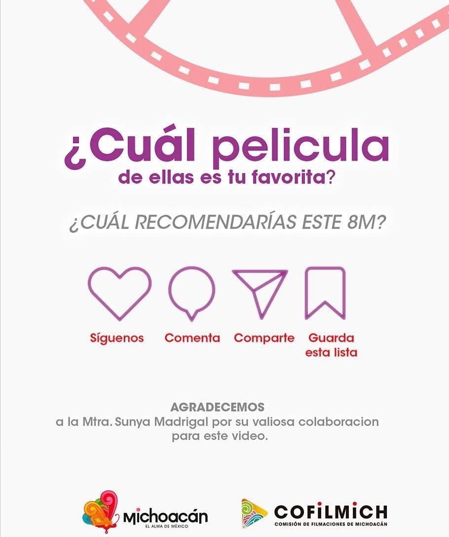 La Cofilmich, mediante sus redes sociales, compartió las recomendaciones que la realizadora Sunya Madrigal, creadora, directora y editora de cine y arte híbrido, que ha logrado que sus obras se proyecten en más de 14 países, difunde para visibilizar, transmitir mensajes, además de que el público se dé la oportunidad de analizar las obras fílmicas durante este mes de marzo.