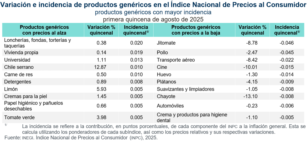 En la primera quincena de agosto de este año, los productos genéricos cuyas variaciones de precios, al alza y a la baja, destacaron por su incidencia sobre la inflación general fueron los siguientes: loncherías, fondas, torterías y taquerías; vivienda propia, así como universidad, con incrementos en sus precios. En contraste, el jitomate, el pollo y el transporte aéreo disminuyeron sus precios.