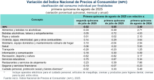 En la primera quincena de agosto de 2025, el INPC registró un nivel de 140.800: disminuyó 0.02 % respecto a la quincena anterior. Con este resultado, la inflación general anual se ubicó en 3.49 por ciento. En el mismo periodo de 2024, la inflación quincenal fue de -0.03 % y la anual, de 5.16 %.