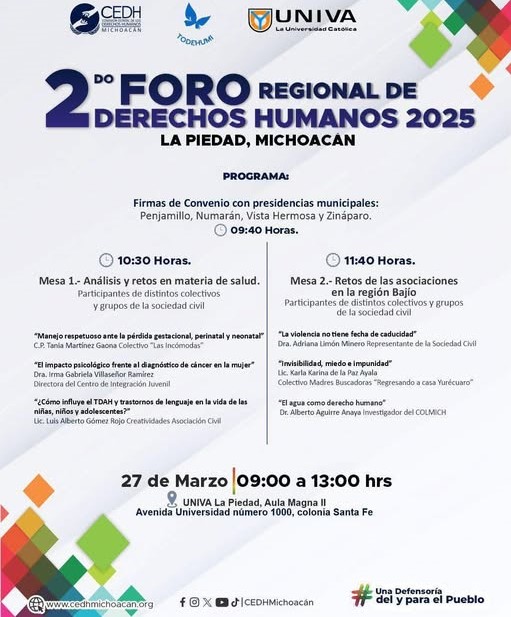 Con la participación y organización de la sociedad civil de la región del bajío michoacano, el próximo jueves 27 de marzo se realizará el segundo Foro Regional de Derechos Humanos, el cual tendrá como sede las instalaciones de la Universidad del Valle de Atemajac, campus La Piedad a partir de las 9:40 am.