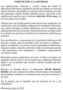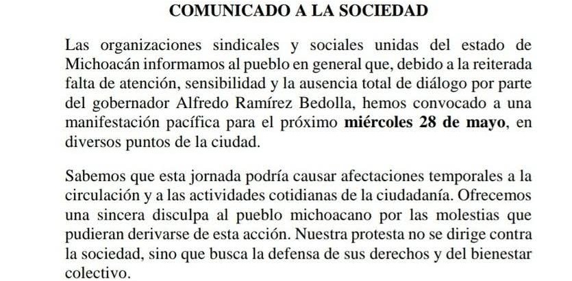 Han reiterado su compromiso por la paz, el orden y el respeto a la legalidad pero «es persistente la indiferencia de Ramírez Bedolla» y sus funcionarios por lo que va a tener lugar mañana esta movilización, a pesar de que le han dado un plazo de lo que resta de este día para que Ramírez Bedolla rectifique y les dé respuesta para poder sentarse cara a cara a una mesa de trabajo.