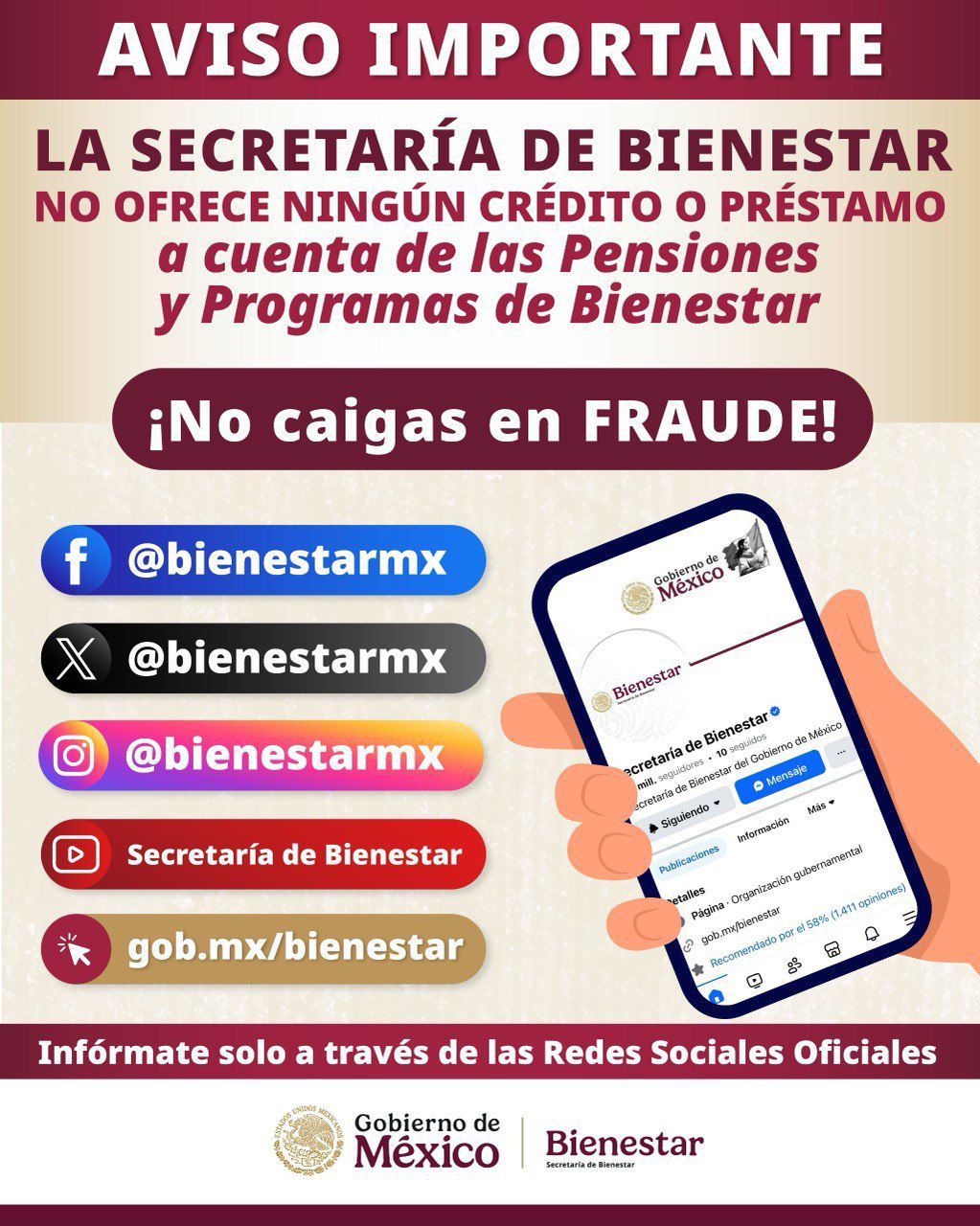 Se exhorta a los beneficiarios y derechohabientes de las Pensiones y Programas para el Bienestar a mantenerse informados a través de la página oficial: gob.mx/bienestar, las redes sociales oficiales @bienestarmx o la Línea de Bienestar 800 639- 42- 64.