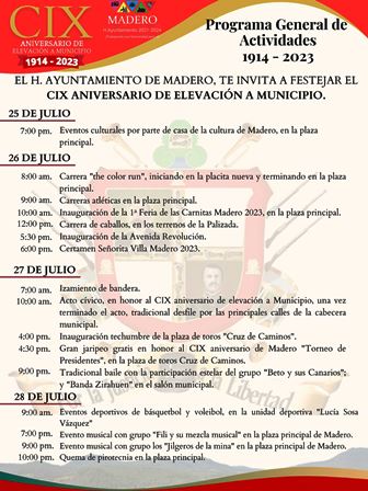 sctur madero 1907El municipio de Madero invita a sus tradicionales fiestas de aniversario, del 25 al 28 de julio, con un programa que incluye carreras atléticas, carreras de caballos, eventos culturales, bailes, la primera Feria de las Carnitas, música, jaripeo y pirotecnia.