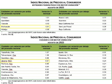 Entre las entidades que registraron la mayor variación en el Indicador Nacional de Precios al Consumidor se encuentra Michoacán con un incremento de 0.91 por ciento para ubicarse en la cuarta posición en la lista que es encabezada por Chiapas, con 1.01%, seguida de Querétaro, con 0.99% y Tlaxcala, con 0.92, en el quinto sitio está Hidalgo, con 0.88 por ciento.