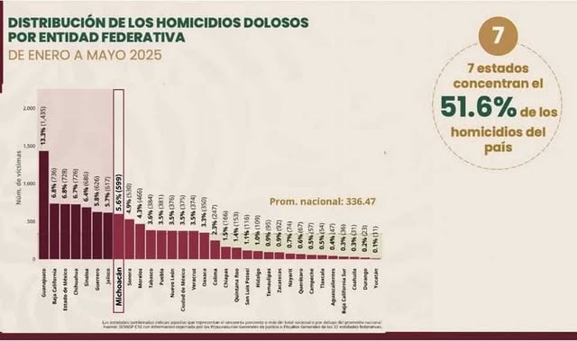 El día de hoy en la rueda de prensa encabezada por la presidenta de la República, Claudia Sheinbaum, se mencionó que Michoacán se encuentra fuera de los siete estados 7 que concentran el 51.6 por ciento del total de homicidios dolosos registrados en el país, basado en datos del Secretariado Ejecutivo del Sistema Nacional de Seguridad Pública (SESNSP).