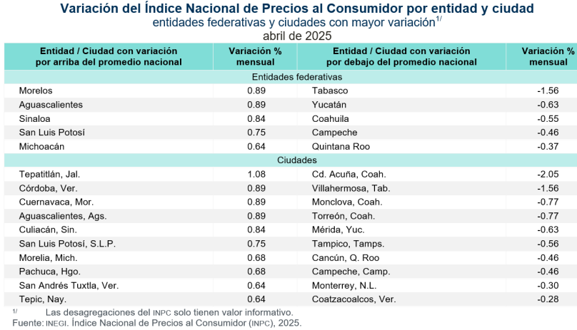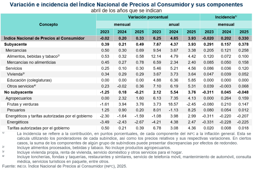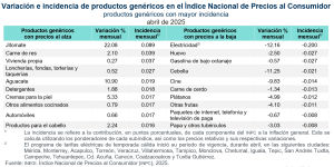 En abril de 2025, los productos genéricos cuyas variaciones de precios, al alza y a la baja, destacaron por su incidencia sobre la inflación general fueron los siguientes: jitomate, carne de res, vivienda propia, así como loncherías, fondas, torterías y taquerías, con incrementos en sus precios. En contraste, la electricidad, el huevo, la gasolina de bajo octanaje y la cebolla disminuyeron sus precios.