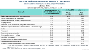 En abril de 2025, el INPC presentó un nivel de 139.620: aumentó 0.33 % respecto al mes anterior. Con este resultado, la inflación general anual se ubicó en 3.93 por ciento. En el mismo mes de 2024, la inflación mensual fue de 0.20 % y la anual, de 4.65 %.
