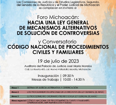 El Poder Judicial de Michoacán y la LXV legislatura del Senado de la República realizarán el Foro: Hacia una Ley General de Mecanismos Alternativos de Solución de Controversias y el Conversatorio Código Nacional de Procedimientos Civiles y Familiares, el próximo 19 de julio en el Auditorio del Palacio de Justicia José María Morelos, en la ciudad de Morelia.