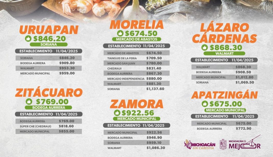 En el comparativo de 13 productos clave para esta temporada como pescado, mariscos, legumbres y pan molido, el Mercado Municipal de Apatzingán destacó por ofrecer el precio más bajo con un total de 675 pesos, seguido por el Mercado de Abastos de Morelia, con 674 pesos.