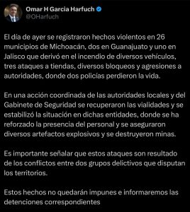Por su parte el secretario de seguridad pública federal, Omar García Harfuch, informó que fueron 26 municipios michoacanos donde se reportaron hechos de violencia, quema de vehículos,tiendas y bloqueos carreteros.