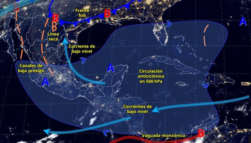 Finalmente, un sistema anticiclónico en niveles medios de la atmósfera, mantendrá ambiente caluroso a muy caluroso en gran parte del territorio nacional, con temperaturas de 35 a 40 °C en 14 entidades de la República Mexicana, y superiores a 40 °C en zonas de Guerrero y Oaxaca.