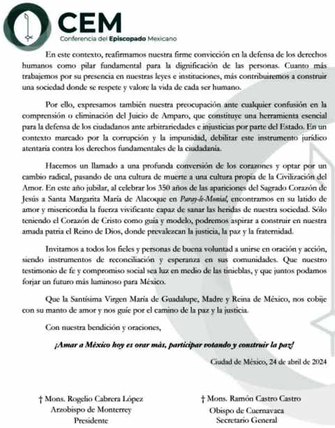 Por lo que hacen un llamado a una profunda conversión de los corazones y optar por un cambio radical pasando de una cultura de muerte a una cultura propia de la civilización del amor, pues de tener lugar esta anulación del amparo haría más vulnerable a toda la sociedad y la ciudadanía, acusan y advierten en misiva pública emitida en las últimas horas en su sitio oficial, firmada por Monseñor Rogelio Cabrera López,  Arzobispo de Monterrey y quien es presidente de la CEM, así como por Monseñor Ramón Castro Castro, obispo de Cuernavaca y secretario general de la misma.