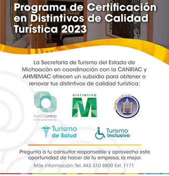 Monroy García comentó que a la fecha Michoacán cuenta con 167 empresas que ostentan al menos siete tipos de certificaciones nacionales vigentes, entre ellas 112 de Punto Limpio, 21 del M; 14 del H, seis del M Ecoturístico, cinco de Constancias del Sistema de Clasificación Hotelera, cinco de Distintivos de Calidad Turística, y cuatro del Código de Conducta Nacional.
