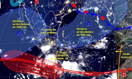 Para hoy, la onda tropical Núm. 25 asociada con una zona de baja presión con probabilidad para desarrollo ciclónico al sur de Oaxaca y Guerrero, generarán lluvias fuertes a muy fuertes en el centro y sur del territorio nacional, incluido el Valle de México, con lluvias puntuales intensas en Guerrero, Oaxaca y Chiapas. Canales de baja presión en el interior de la República Mexicana y el ingreso de humedad proveniente de ambos océanos, ocasionarán chubascos con lluvias puntuales fuertes en el occidente, centro y sur del país, incluida la Península de Yucatán, con lluvias puntuales muy fuertes en Jalisco, Colima, Michoacán, Puebla y Veracruz.