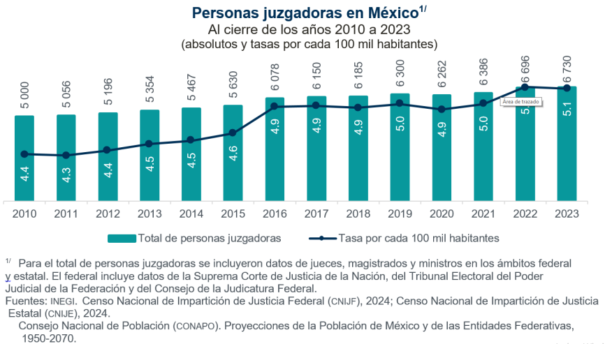 Al cierre de ese año, había 6 mil 730 personas juzgadoras en México, lo que representó una tasa de 5.1 personas juzgadoras por cada 100 mil habitantes