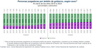En el ámbito federal se registraron mil 632 personas juzgadoras al cierre de 2023, de las cuales 29.4 % fueron mujeres. En el ámbito estatal, de las 5 mil 098 personas juzgadoras, 44.1 % fueron mujeres y 55.9 %, hombres. Entre 2010 y 2023, hubo un aumento en el porcentaje de la participación de las mujeres como personas juzgadoras, tanto en los tribunales federales como estatales.