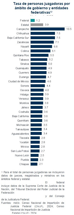 La tasa de personas juzgadoras en los órganos jurisdiccionales estatales por cada 100 mil habitantes, al cierre de 2023, fue de 3.9, mientras que en el ámbito federal fue de 1.2. Por entidad federativa, Campeche registró la tasa más alta (10.5); le siguieron Chihuahua (7.5) y Baja California Sur (7.5). Por otra parte, Nuevo León (2.5), Puebla (2.3) y Chiapas (2.1) registraron las tasas más bajas.
