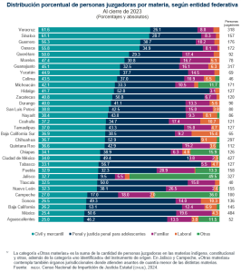 Respecto a la distribución de las personas juzgadoras por tipo de materia en los tribunales estatales, en Veracruz, Sinaloa, Guerrero, Oaxaca y Querétaro, la mayoría (50 % o más) de jueces y juezas atendieron asuntos de las materias civil y mercantil.