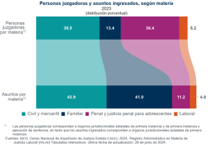 Los órganos jurisdiccionales estatales de primera instancia recibieron un total de 2 millones 281 mil 806 asuntos en 2023. De estos, 41.0 %, correspondió a la materia familiar y 11.2 %, a las materias penal y justicia penal para adolescentes. En contraste, de las 5 mil 098 personas juzgadoras en los órganos jurisdiccionales estatales de primera instancia, 13.4 % atendió la materia familiar y 36.4 %, a las materias penal y justicia para adolescentes.