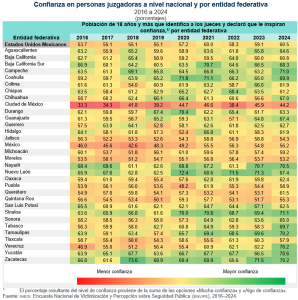 En 2024, 60.5 % de las personas de 18 años y más que identificó a los jueces declaró que estos “le inspiran confianza”. Se observó un aumento de 6.8 puntos porcentuales en los niveles de confianza en el periodo de 2016 a 2024. En 7 entidades federativas, la percepción de confianza en personas juzgadoras en 2024 fue superior a 70 por ciento. Dichas entidades fueron Sinaloa, Campeche, Yucatán, Nayarit, Tamaulipas, Zacatecas y Veracruz. Asimismo, destacó el caso de la Ciudad de México, que exhibió los niveles de confianza más bajos en todo el periodo de referencia.