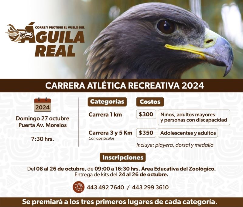 El Parque Zoológico «Benito Juárez» de Morelia, dio a conocer la realización de su «Carrera del Águila», la cual, tiene como principal objetivo crear conciencia en la ciudadanía sobre la preservación, protección y respeto hacia esta emblemática ave, además de generar recursos para mejorar su hábitat.