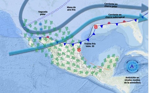 Hoy, el frente frío núm. 33 y su masa de aire frío asociada se desplazarán en el transcurso del día sobre el norte y noreste de México, en combinación con una vaguada polar y las corrientes en chorro polar y subtropical, propiciarán rachas de viento de 70 a 90 km/h en Chihuahua, Durango y Coahuila, y de 50 a 70 km/h en Zacatecas, Aguascalientes, San Luis Potosí y Nuevo León, todos con tolvaneras; además se pronostican lluvias aisladas y condiciones para la caída de nieve o aguanieve durante esta mañana en Baja California, Sonora y Chihuahua. A final del día, iniciará evento de «Norte» con rachas de viento de 70 a 90 km/h en Tamaulipas, extendiéndose durante la madrugada del domingo hacia Veracruz.