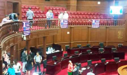 Mantas que también fueron expuestas en los barandales del patio central de Palacio.