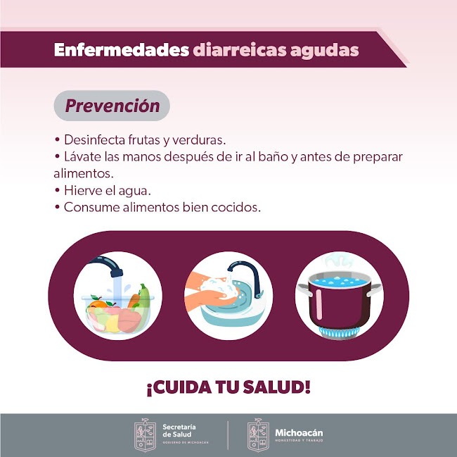 Se invita a las y los michoacanos a lavarse las manos con agua y jabón, o usar gel antibacterial antes de comer, después de ir al baño y antes de preparar alimentos, así como no automedicarse y acudir al médico ante cualquier signo de diarrea, náusea y vómito. Otro de los padecimientos relacionados con diarreas es la salmonelosis, la cual provoca la inflamación del intestino delgado y el colon y se da principalmente por la falta de medidas básicas de higiene que consisten en el correcto lavado de manos y en la desinfección de los alimentos.