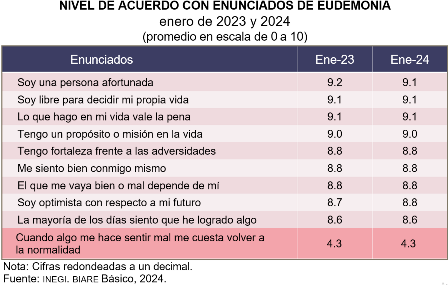 Desde hace más de diez años, el Instituto Nacional de Estadística y Geografía (INEGI) ofrece datos sobre el bienestar subjetivo en México, a partir de indicadores de bienestar autorreportado de la población adulta que reside en el ámbito urbano. La medición del bienestar subjetivo, a través de los módulos básicos de Bienestar Autorreportado (BIARE Básico), se basa en la valoración que otorgan las personas a tres aspectos de su bienestar: 1) balance anímico, que explora la prevalencia de estados de ánimo, tanto positivos como negativos, durante el día anterior a la entrevista; 2) satisfacción con la vida en general y con ámbitos específicos de la misma, denominados «dominios de satisfacción» y 3) eudemonía o bienestar espiritual, que se observa en el acuerdo que muestran las personas con enunciados que denotan fortaleza y sentido de vida.