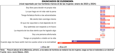Para enero de 2023 y enero de 2024, las brechas entre hombres y mujeres, según el promedio en el nivel de desacuerdo o acuerdo con los enunciados de eudemonía. Entre dichos periodos, se redujo la brecha entre el promedio de mujeres y hombres que reportaron estar de acuerdo con cuando algo me hace sentir mal me cuesta volver a la normalidad.