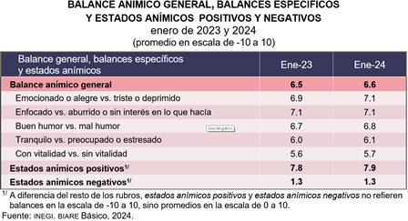 Un aspecto relacionado con el bienestar subjetivo es el balance anímico, indicador de la situación emocional de la población. Para su construcción, se pide a la persona entrevistada que determine, en una escala de 0 a 10, qué tanto predominaron, a lo largo del día anterior a la entrevista, una serie de estados de ánimo, tanto positivos como negativos. El balance anímico general se obtiene de restar los puntajes de estados de ánimo negativos a los positivos. Los valores finales del balance se sitúan en una escala que va desde -10 hasta 10 para facilitar su interpretación.