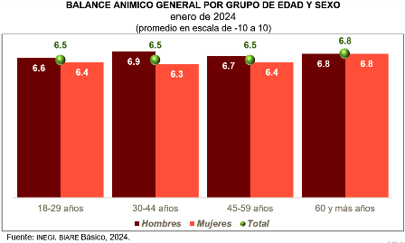 El promedio, en escala de 0 a 10, de la satisfacción con la vida por grupo de edad y sexo, en enero de 2024, la población adulta de 18 a 29 y de 30 a 44 años reportó los mismos promedios de satisfacción (8.5). Estos bajaron en los siguientes grupos de edad de las y los entrevistados. En todos los grupos hay brechas entre mujeres y hombres en el promedio de satisfacción. La mayor brecha se encontró entre mujeres y hombres de 30 a 44 años: en este grupo, se reportó el promedio de satisfacción más alto entre los hombres adultos. Asimismo, hombres y mujeres del grupo de 60 y más coincidieron y calificaron en lo más bajo satisfacción con la vida.