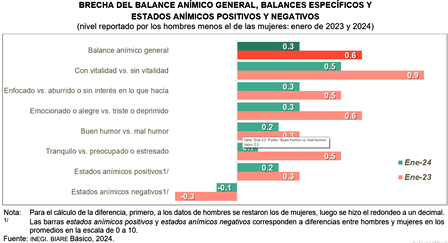 En las diferencias entre mujeres y hombres en los promedios de balances anímicos general y específicos, así como en los de estados anímicos positivos y negativos, tanto en enero de 2023 como enero de 2024 se observa el cambio en las brechas entre hombres y mujeres respecto al año anterior. Las diferencias positivas indican que los hombres reportaron valores más altos que las mujeres. La única diferencia negativa, en la que las mujeres registraron niveles más altos que los hombres, fue en el promedio de estados anímicos negativos.
