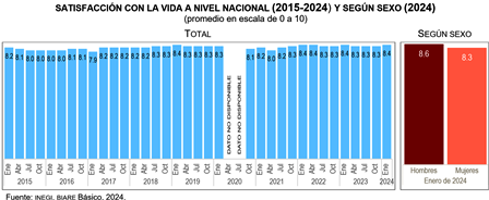 En enero de 2024, se obtuvo un valor promedio de 8.4 en el reporte de satisfacción con la vida en general de la población adulta, igual que en enero de 2023 y 2022. En cuanto a la brecha entre hombres y mujeres, de nueva cuenta, los hombres presentaron un nivel de satisfacción superior al de las mujeres: 8.6 frente a 8.3, respectivamente.
