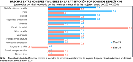 Los resultados positivos muestran brechas donde los hombres reportaron mayores promedios que las mujeres. Esto sucedió en todos los ámbitos, excepto en la satisfacción con los logros en la vida. Al ver los valores de enero de 2023 y 2024, se notaron cambios en las brechas en todos los dominios, excepto vecindario. La brecha en la satisfacción con el país, entre hombres y mujeres, se incrementó notablemente en 2024. La brecha en la satisfacción con la salud, entre mujeres y hombres, fue la que más disminuyó de 2023 a 2024.