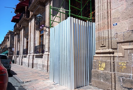 En el marco de la marcha del 8M en Morelia, colocan protección metálica a la puerta de Palacio de Gobierno.