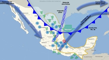 Este día, el frente frío No. 35 y su masa de aire ártico se desplazarán rápidamente sobre el interior del país y la vertiente del Golfo de México, generando marcado descenso de la temperatura diurna en gran parte del territorio nacional, además de evento de “Norte” de muy fuerte a intenso con oleaje elevado en el litoral del Golfo de México e Istmo y Golfo de Tehuantepec; en interacción con una vaguada polar que cruzará el noreste, centro y oriente de la República Mexicana, y el abundante ingreso de humedad del Pacífico, originado por la corriente en chorro subtropical, así como del Mar Caribe; propiciarán chubascos con lluvias fuertes a puntuales muy fuertes en el norte, noreste, occidente, centro, sur y sureste del país, incluidos el Valle de México y la Península de Yucatán, además de puntuales intensas en Puebla y Veracruz; dichas lluvias estarán acompañadas de rachas fuertes de viento, descargas eléctricas y probable caída de granizo. También se prevé caída de nieve o aguanieve en zonas altas de Chihuahua, Coahuila, Nuevo León, Tamaulipas, Durango, Zacatecas, San Luis Potosí, Michoacán, Guanajuato, Querétaro, Hidalgo, Estado de México, Ciudad de México, Morelos, Tlaxcala, Puebla y Veracruz.