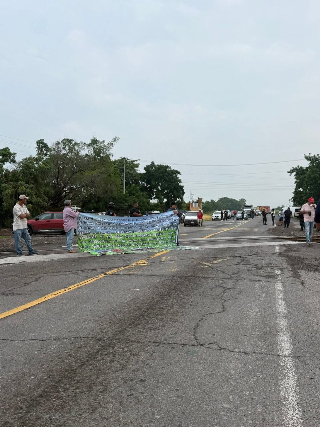 Múgica, Michoacán.- La mañana de este viernes, decenas de productores de arroz de la región bloquearon de manera pacífica la carretera que conecta de Nueva Italia a Lombardía, a la altura de la comunidad de La Laguna, justo en el cruce con las vías férreas, para exigir al gobierno federal el pago del precio de garantía correspondiente al ciclo Primavera-Verano 2024.